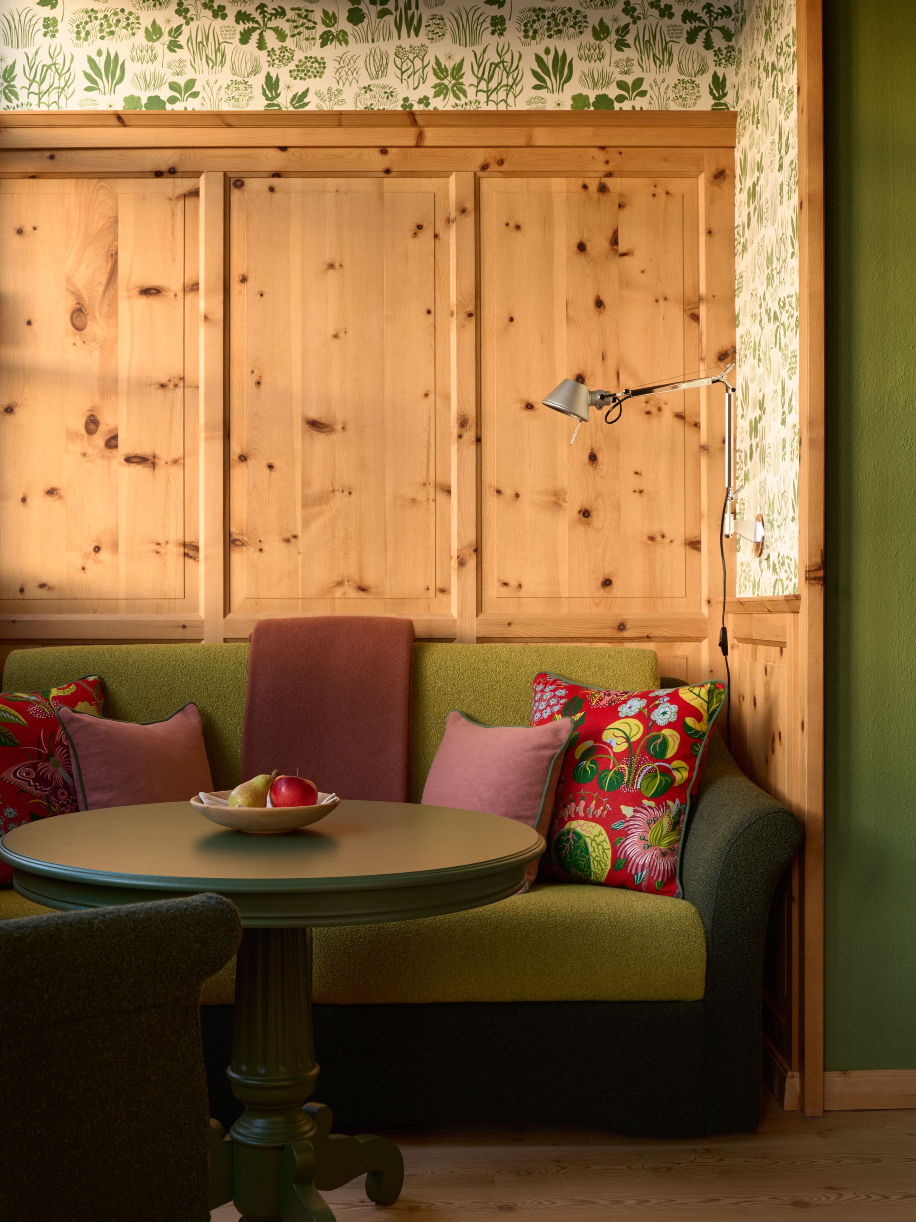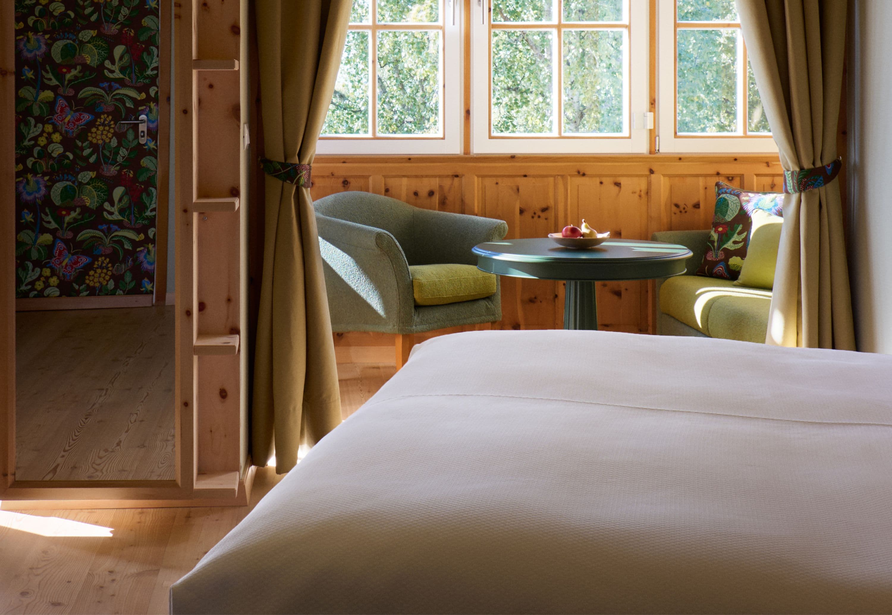 Die intime Salonatmosphäre der kleinsten Suiten des Berghoferin mit Zirbenholzverkleidung im Schlafbereich, warmen und satten Farbtönen, markanten floralen Mustern sowie einer Fülle üppiger, luxuriöser Stoffe vermittelt Geborgenheit und Komfort.